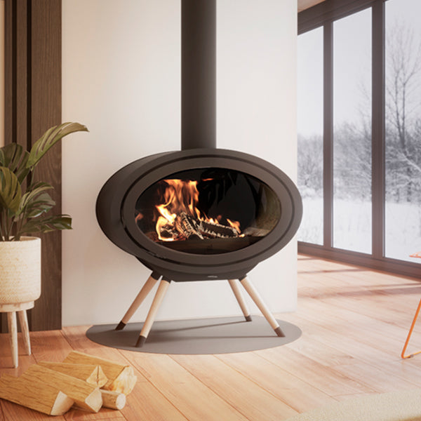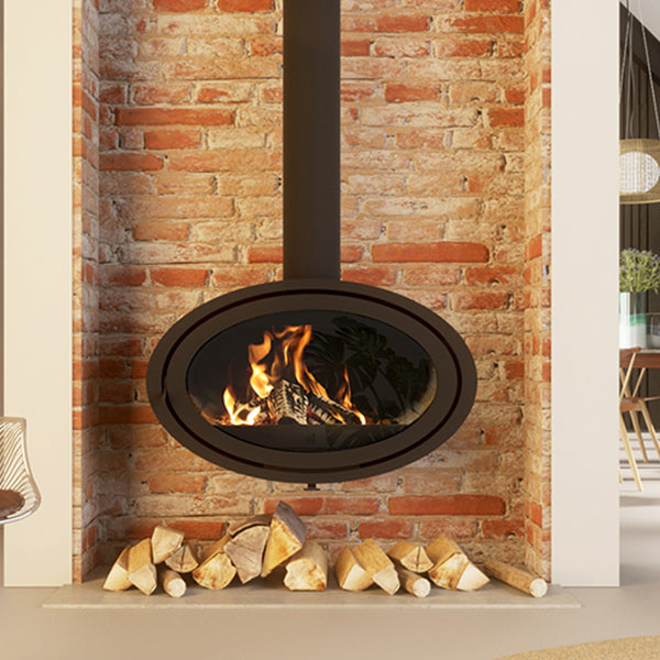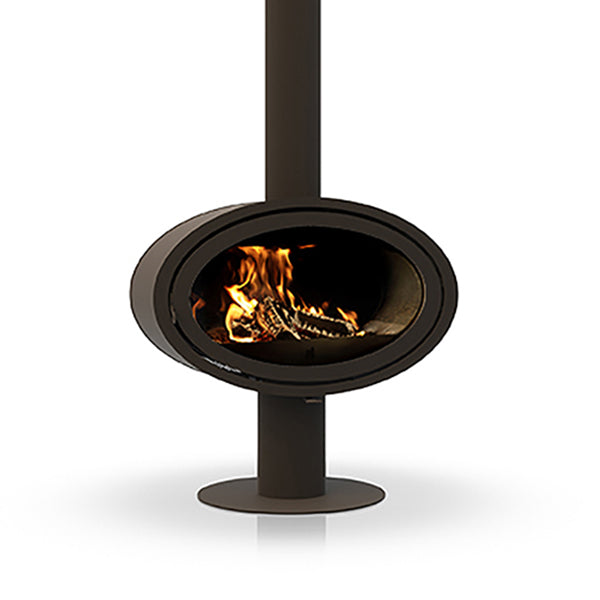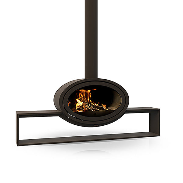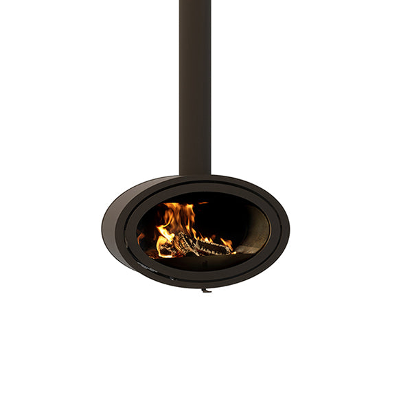 The Oval Front is the stove body only and then has a number of different installation options available such as ceiling suspended, wall hung, or floor standing.