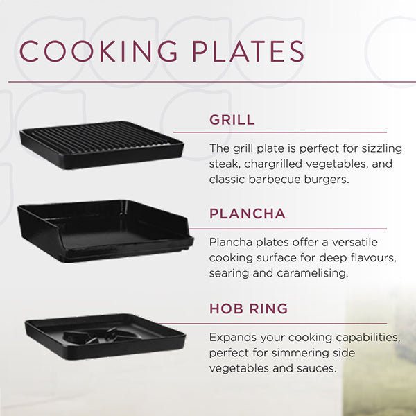 Comes with a choice of either Grill or Plancha plate, and additional plates can be purchased.