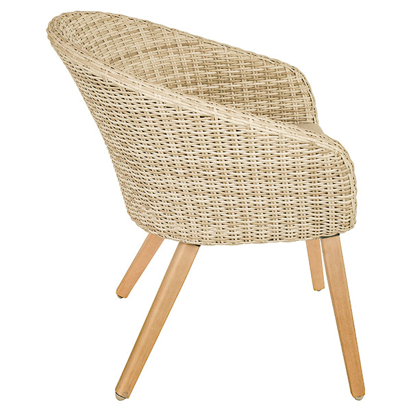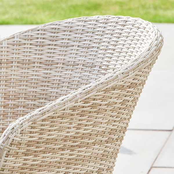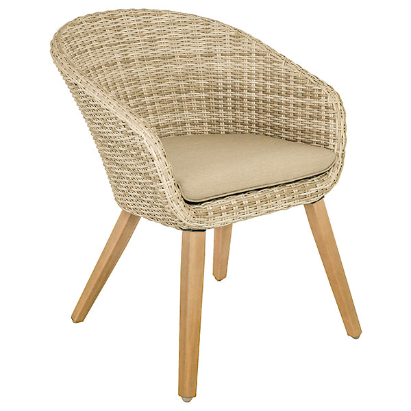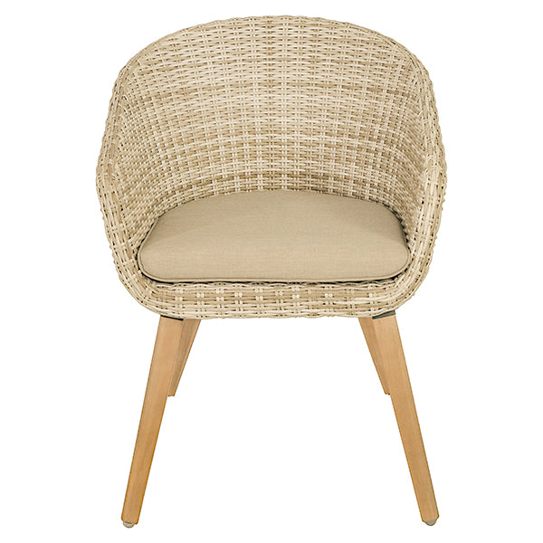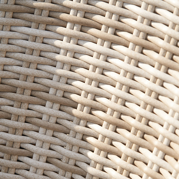 The chairs boast a stylish half-round synthetic rattan weave in a chic pebble color, supported by durable acacia wood legs. For added comfort, the chairs are equipped with pebble-colored Olefin cushions, a synthetic fabric renowned for its resistance to stains and fading, as well as its quick-drying properties—ideal for outdoor settings. To keep your dining set looking fresh and in top condition, we recommend using an Aerocover when not in use. Enjoy al fresco dining in style with this timeless and practical dining set!