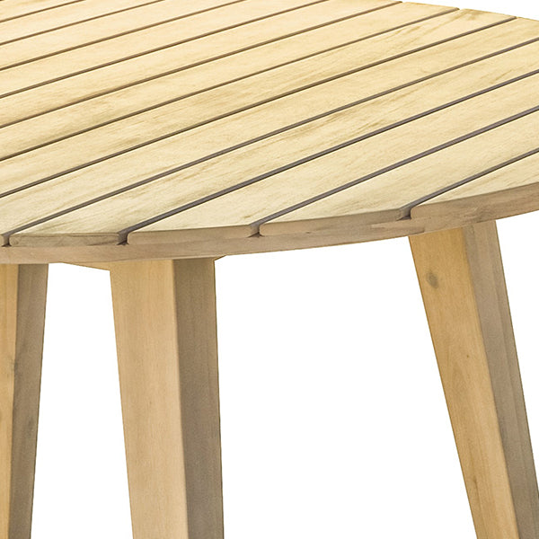 Enhance your outdoor dining experience with the Cabon 4 Seater Round Dining Set, expertly handcrafted in Vietnam by skilled artisans. This elegant set features a light teak effect acacia wood table with a slatted design, perfectly paired with four comfortable dining chairs. Acacia wood is an environmentally friendly option, known for its fast-growing qualities, making it a sustainable choice for outdoor furniture.