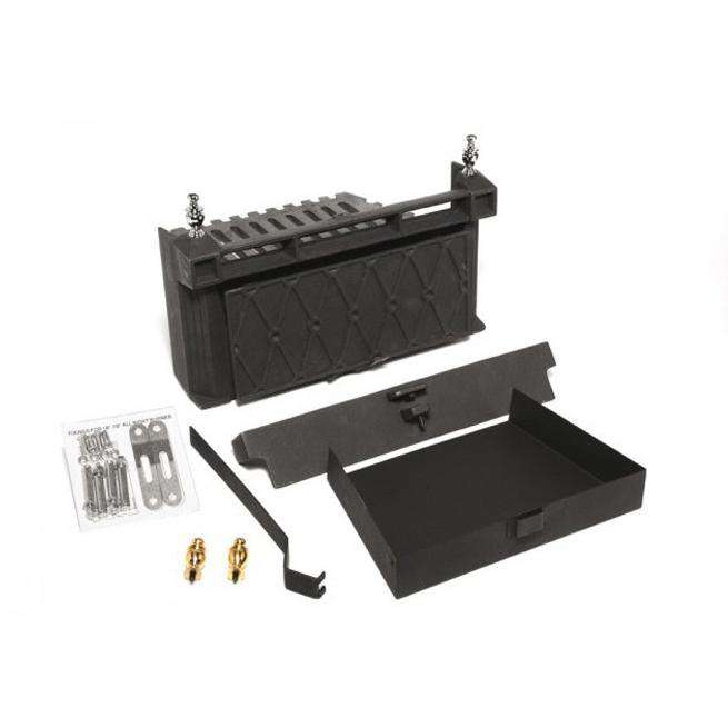 This 16" Lattice All Night Burner (Black) fits into a standard 16-inch fireback opening. Both brass & chrome finials are included in the box for you to choose from.
