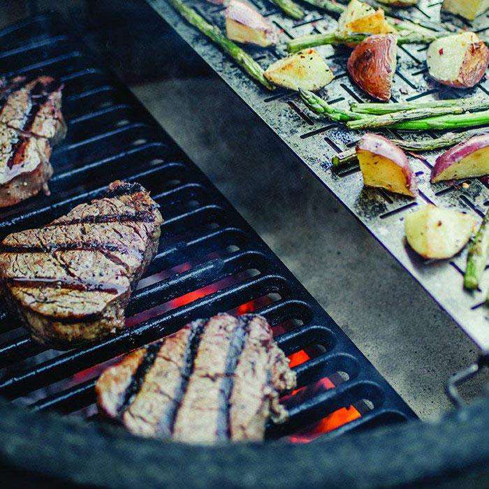 The excellent heat retention and longlasting durability makes cast iron the ideal surface material when cooking meats. This hearty grate marks seared meats and seals in fatty juices, resulting in an even more flavoursome meal.