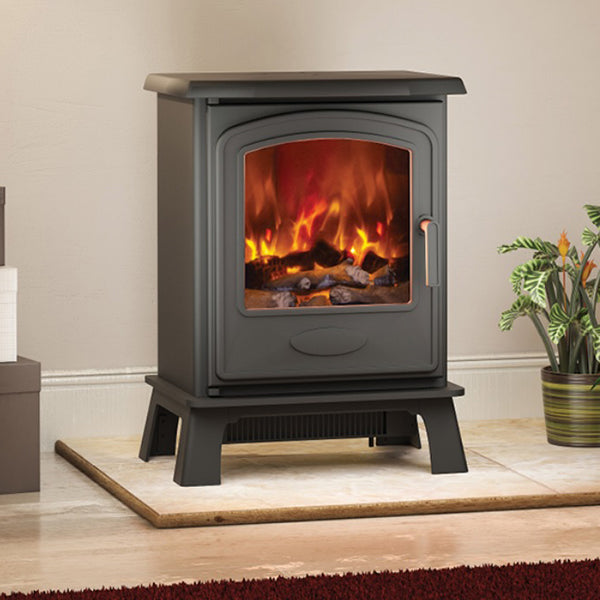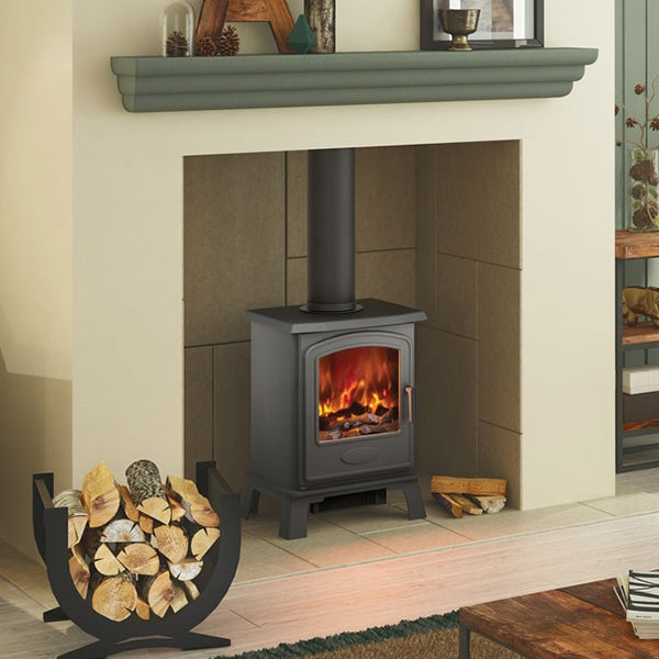 The traditional Flare Ora 5 & 7 freestanding electric stove boasts a gentle arched window set into a Cast Iron door with Steel body. Beautifully finished in Matt Black, the realistic glowing log bed shimmers beneath the dancing flames; enjoy up to 2kW heat or flame effect only, saving energy and money. This stove is designed to ensure reliable, efficient operation – it's an ideal choice for your home.