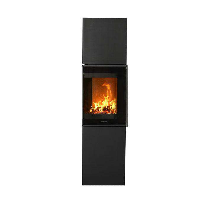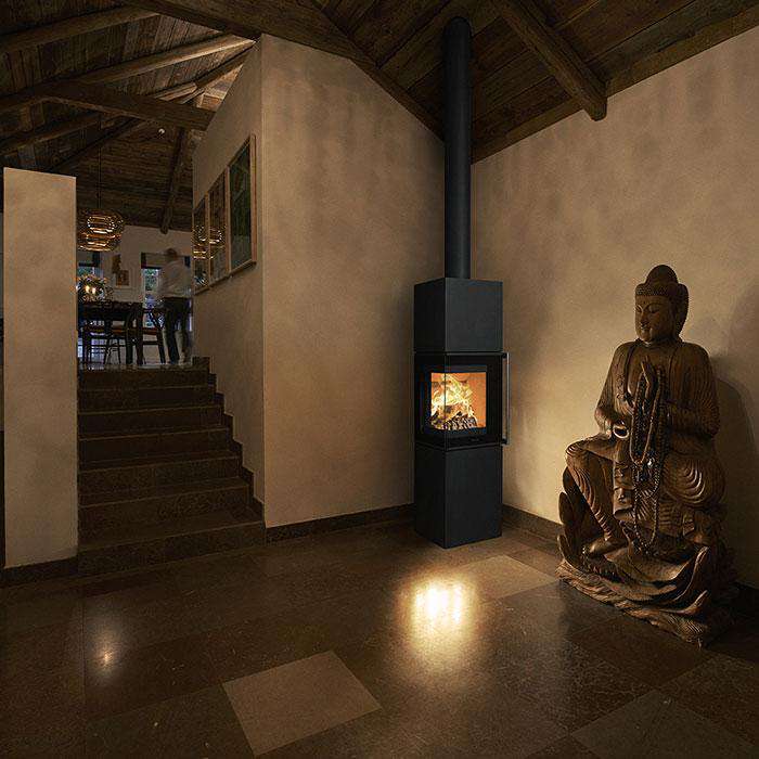 Made from Black steel, the Morso 4340 has achieved SIA Eco Design Ready Status, making it one of the most eco-friendly stoves on the market. The spectacular glass door that exposes the view of the flames to the side and the front is easy to open and close with its elegant handle — designed as an integral part of the door. The automatic closing system ensures the door shuts tightly with suction every time.