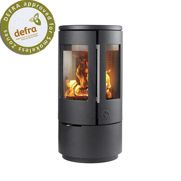 The stove features a 250mm plain base, three glass panels for panoramic viewing, and a tertiary air system for a clean burn.