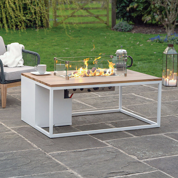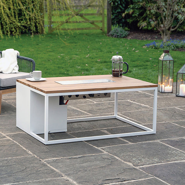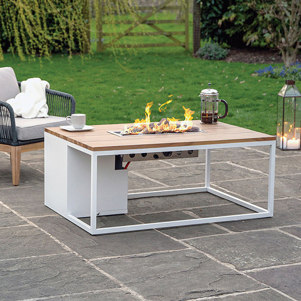 The Cosiloft 120 White and Teak Fire Pit Table features an openwork aluminium frame, combined with a Teak wood top for a modern natural look, making this table stylish and easy care. The rectangle shape means there is ample room for entertaining, it fits a 5kg propane gas bottle which is hidden away from view in a compartment under the table and doubles up as a contemporary design feature.