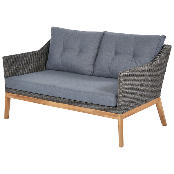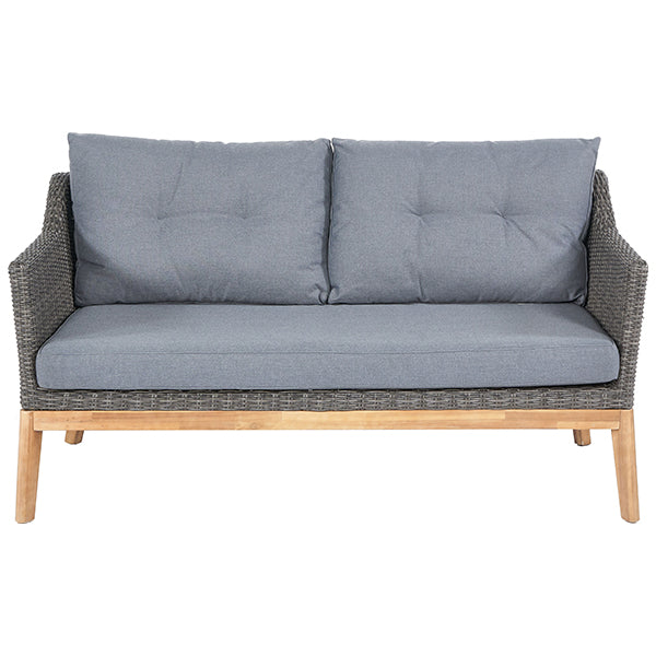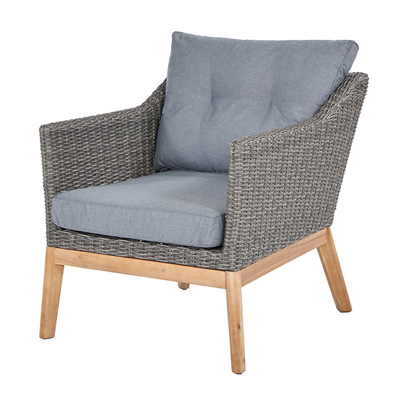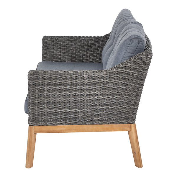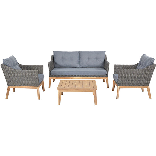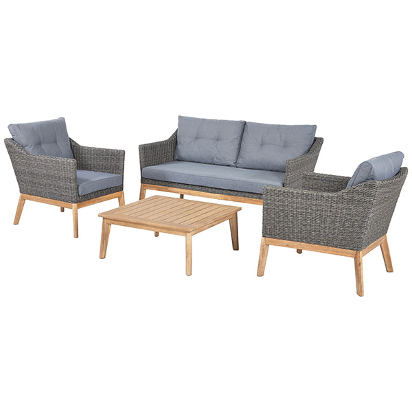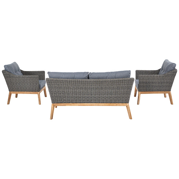 The Larissa Lounge Set offers a chic combination of synthetic rattan with quality wood detailing in a stylish Kubu Grey. With a raised seating style, set on tapered legs, and high back cushions, this set gives you a supportive and stylish alternative to a lower lounging style set.