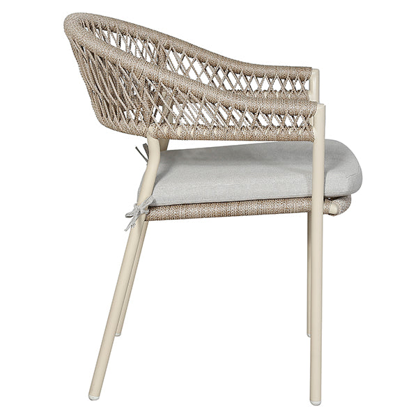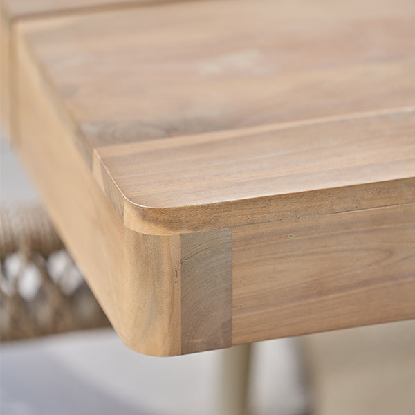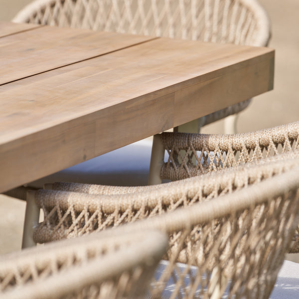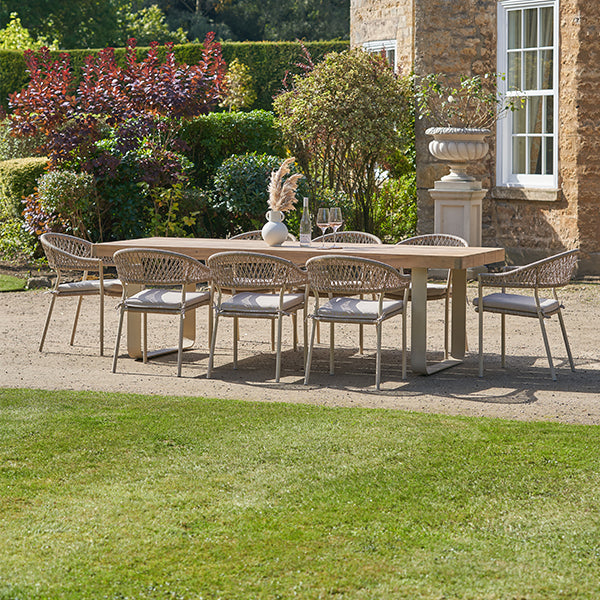 Elevate your outdoor dining experience with the Osaka 8 Seater Outdoor Dining Set. This stunning set features a rounded rectangular dining table paired with elegant curved back chairs, seamlessly combining style and functionality. Crafted from environmentally friendly light teak effect acacia wood, this set boasts a latte-colored powder-coated aluminum frame and a natural color rope weave that enhances its contemporary design.