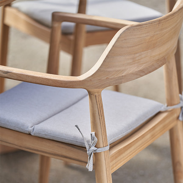 Elevate your outdoor dining experience with the Salita 6 Seater Dining Set. Featuring a sleek rounded rectangular teak table and elegantly curved-back chairs, this set blends timeless style with durability. The natural teak wood frame is complemented by light linen oatmeal olefin fabric cushions, which are season-proof, stain-resistant, fade-resistant, and fire-retardant for lasting quality.