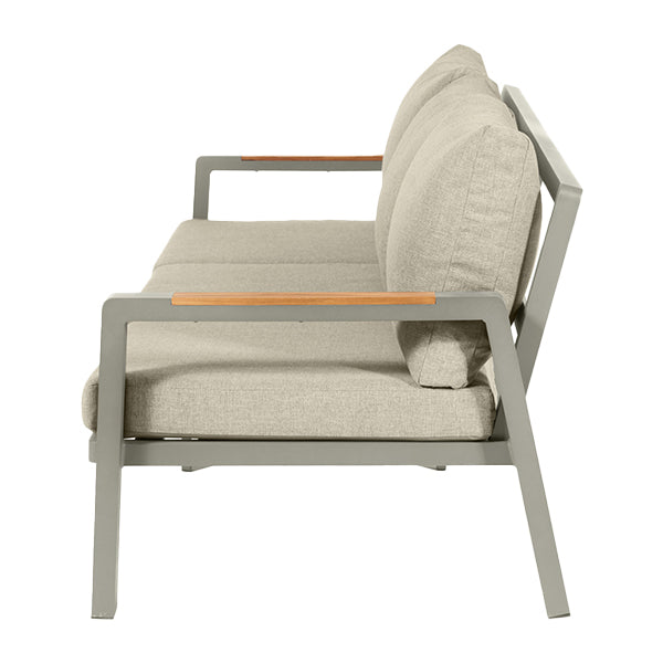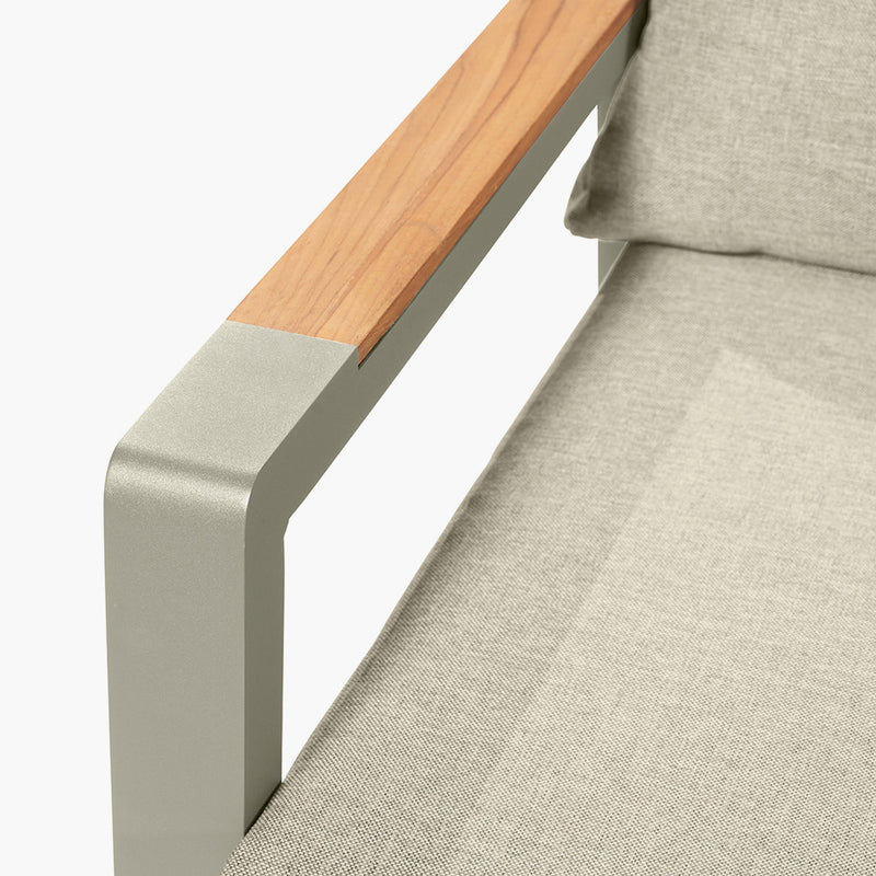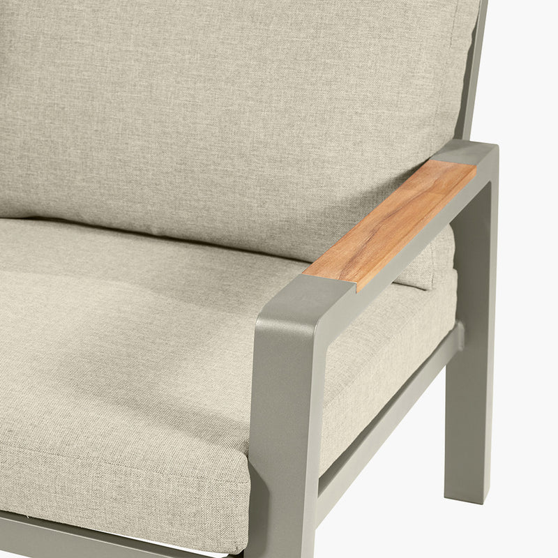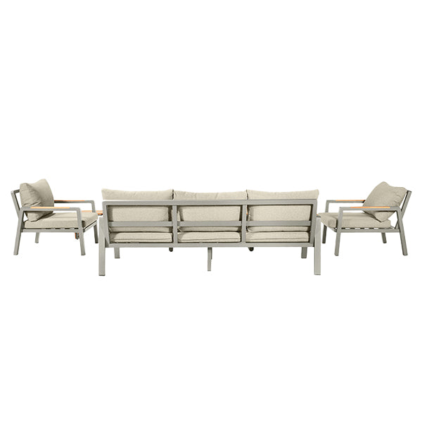 The Stockholm Outdoor Lounge Set is the perfect addition to the garden to create a lounging haven. The set comprises of a 3 Seater Sofa, 2 Armchairs, 1 Coffee Table and a 1 Side Table, all of which have the powdercoated aluminium frame finished in Limestone, with natural Teak Wood detailing, both durable and weather proof.